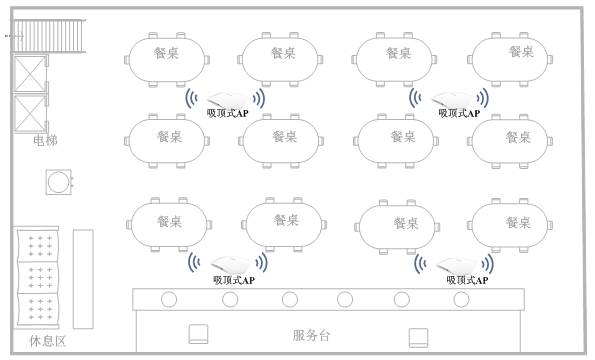 酒店餐廳相對空曠,阻隔物較少,可根據餐廳規(guī)模及吸頂式AP覆蓋范圍酌情部署,布點點位均勻分布,如下圖所示: