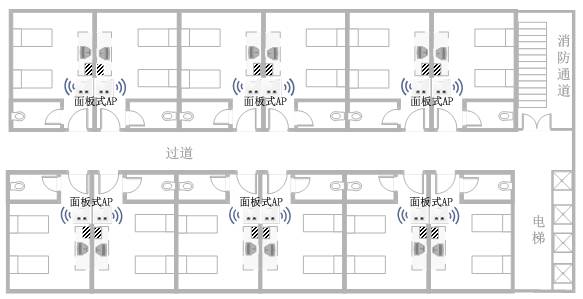 客房接入環(huán)境密集、墻壁阻隔較多,對無線信號的衰減相對較大,面板式AP推薦每個房間部署一臺。如下圖所示: