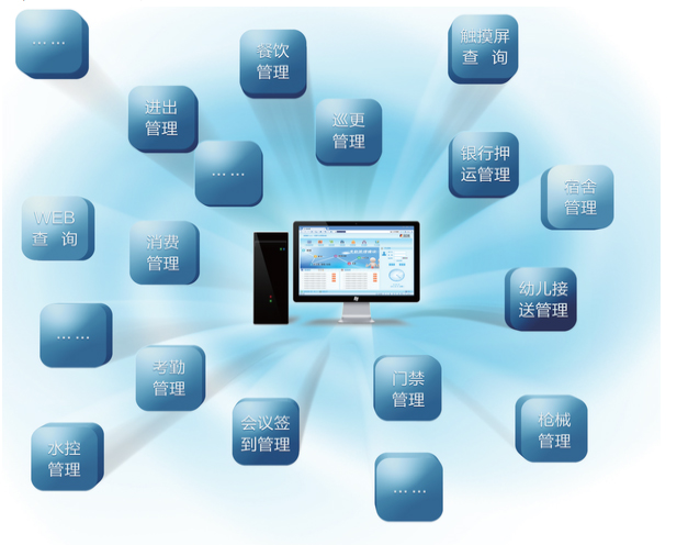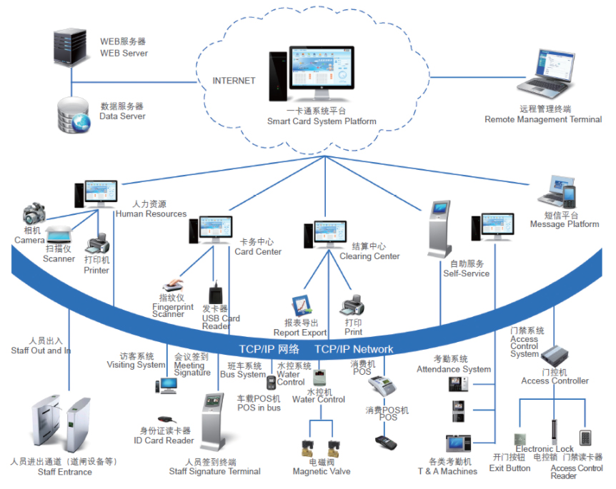 系統(tǒng)以一卡通管理系統(tǒng)為核心,通過網(wǎng)絡(luò)連接各功能模塊構(gòu)成系統(tǒng)的基本框架,由于系統(tǒng)按模塊設(shè)計,可根據(jù)管理和發(fā)展的需要量體裁衣,分步實施,任意增減功能和擴充規(guī)模。